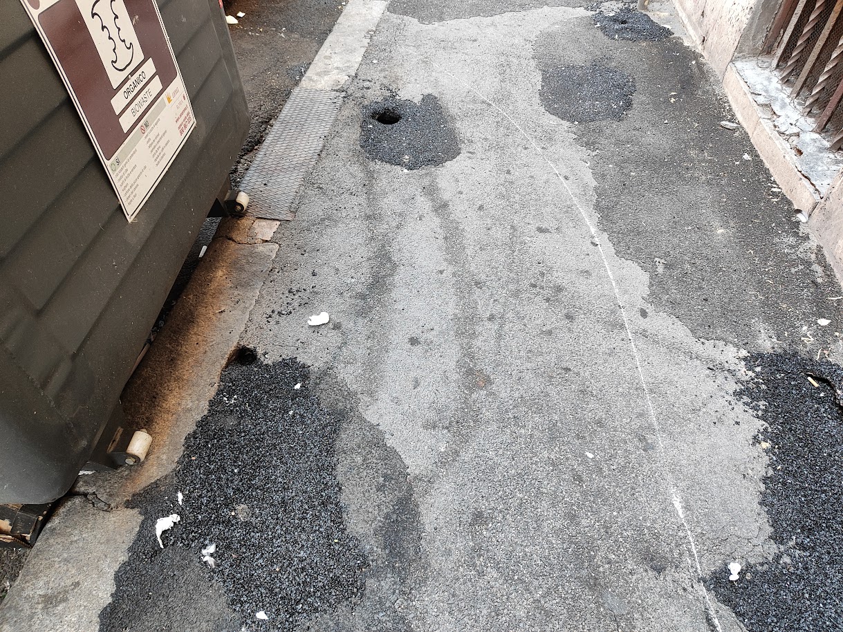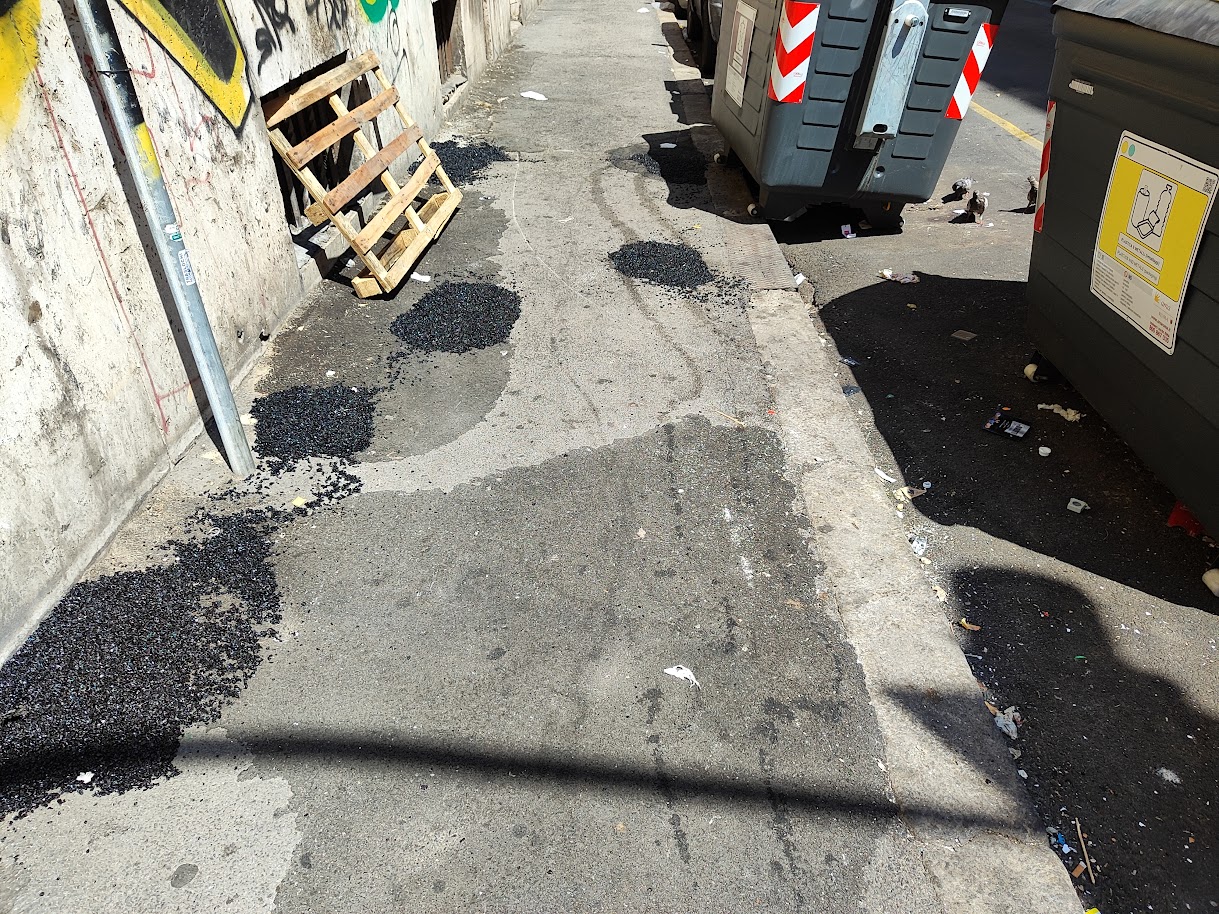 Quelli di via Bixio non si accontentano di utilizzare la feritoia della fogna lì presente, ma con grande maestria aprono buchi sul piano del marciapiede per assicurarsi maggiori vie di fuga e di riparo in presenza di pericoli. Specie la sera si assiste ad un continuo via vai alimentato sprattutto dai rifiuti gettati fuori dai cassonetti. Martedì 22 agosto una squadra del Comune è arrivata sul posto ed ha tappato i buchi con il solito asfalto a freddo che viene utilizzato anche per le strade e il risultato alla fine del lavoro era questo (notare quanti fori avevano aperto i roditori)