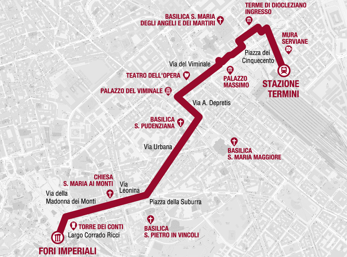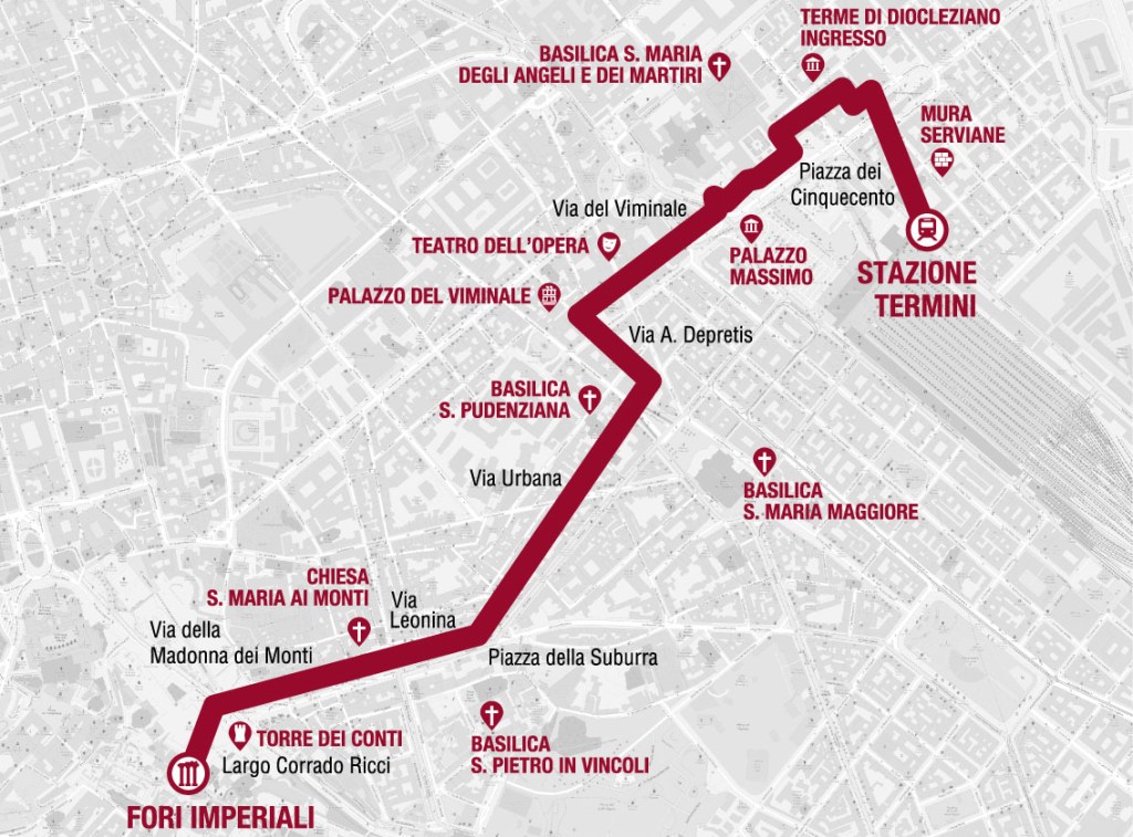 Il percorso del nuovo itinerario Termini-Fori parte dal box informativo di piazza dei Cinquecento, lato Mura Serviane, dove sono in distribuzione le mappe del percorso. Dalla stazione Termini si prosegue verso le terme di Diocleziano, Palazzo Massimo, via del Viminale, via Agostino Depretis, via Urbana e via Leonina per poi arrivare a via dei Fori Imperiali, che viene interamente pedonalizzata anche nella giornata di sabato 11 settembre.
