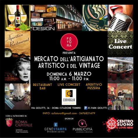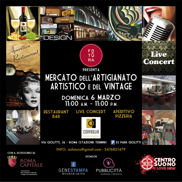 l’Associazione Culturale FUTURA torna a proporre il fortunato evento “Il Mercato dell’Artigianato Artistico e del Vintage”, con il patrocinio di Roma Capitale e la partnership con Radio Centro Suono (l’evento è già pubblicizzato con vari passaggi radiofonici giornalieri).