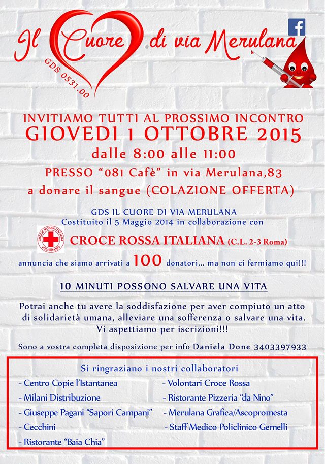 DONARE IL SANGUE, è un gesto umanitario, un gesto di sensibilità, un gesto che possiamo fare tutti noi dedicando 10 minuti della nostra vita per salvarne una o di più, fermandoci un attimo e pensare a chi veramente ne ha bisogno. “IL CUORE DI VIA MERULANA”  vi aspetta  tutti.
