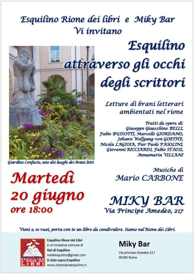 20/6/23 “Esquilino attraverso gli occhi degli scrittori” Letture di brani letterari ambientati nel Rione presso il Miky Bar