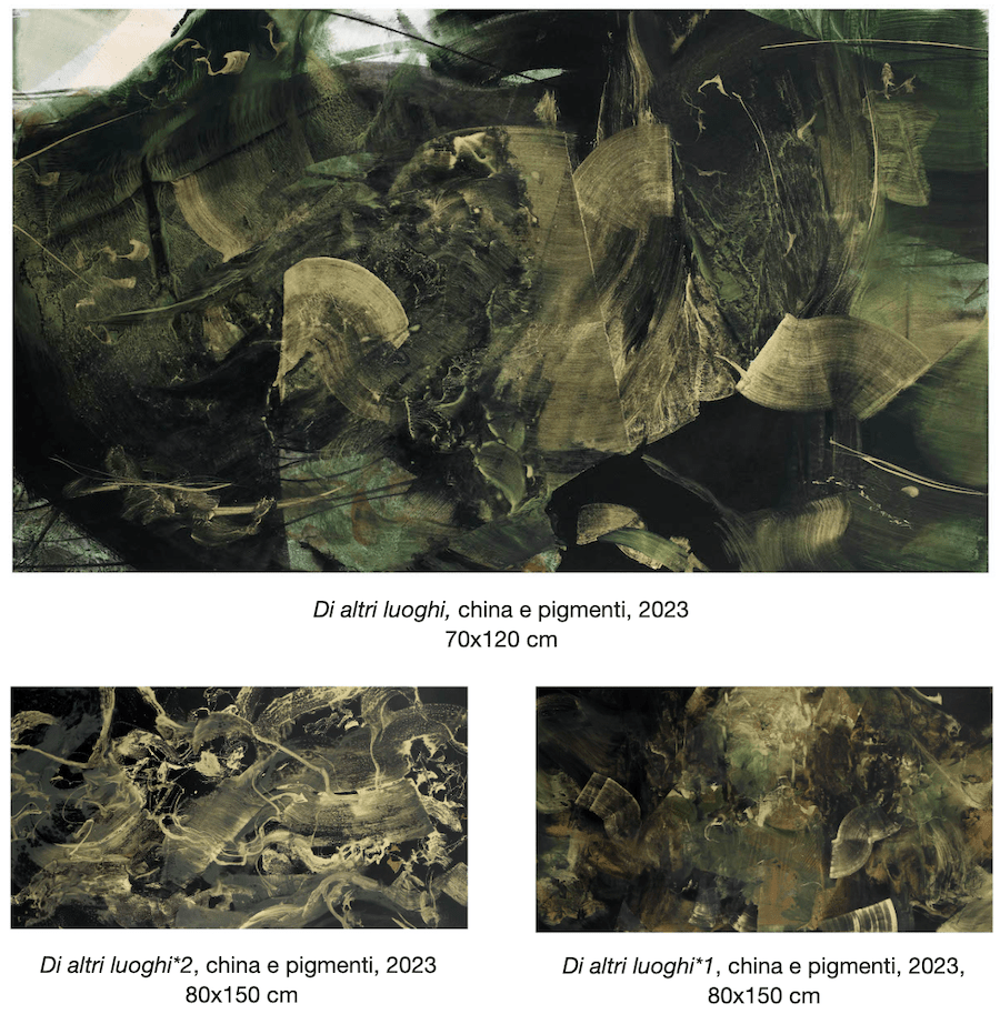 Dalla conca dei colori, come fosse un cratere vulcanico, i verdi, i neri e il color dell’oro attingono dalle onde della meditazione, dal fuoco, dalle arie di antiche musiche, da spartiti del tutto contemporanei, da un non so che di raffinatamente orientale, ma anche dalla terra e dal fango, da radici e rami secchi, da contorti tralci di vite con gli appassiti acini, da rimandi letterari di un profondo e libero pensiero, fondendosi in atmosfere notturne, si imprimono e si svelano sulle larghe campiture accuratamente predisposte, per via di gesti ampi e veloci, ma anche a volte lentissimi, scoprendone la meraviglia contrapposta alla caducità della vita”.